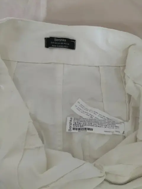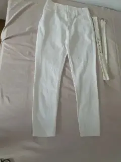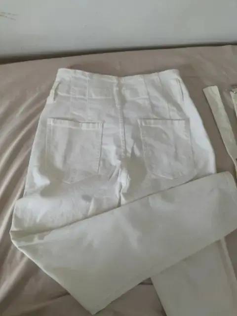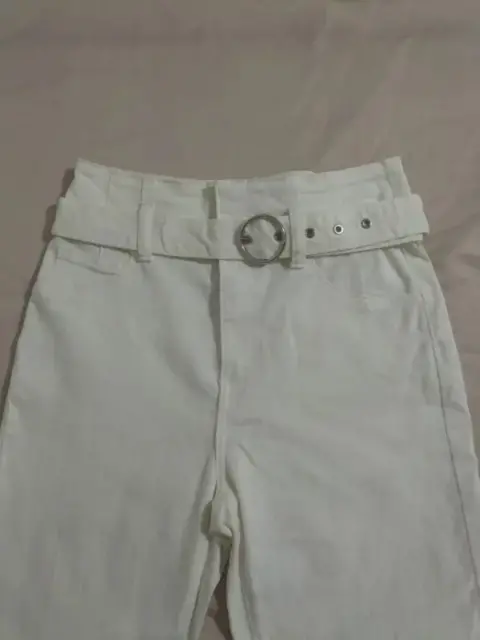 Pantalon Mezclilla talla 28 pero viene amplio tiro alto color blanco sin botón con broche y cierre se puede usar con cinturón o solo, mide 35 cm de cintura alta , 40 cm de cintura media 45 de cadera recuerden k es al doble k da la medida solo medi la parte frontal