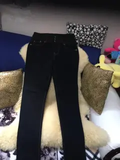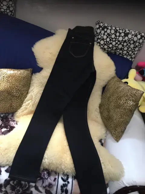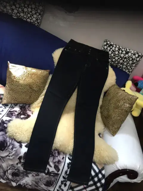 Pantalón a la cintura de tres botones con cierre tiene bolsas es negro marcado con costuras de hilo color dorado entubado a excelentes condiciones marca de NY