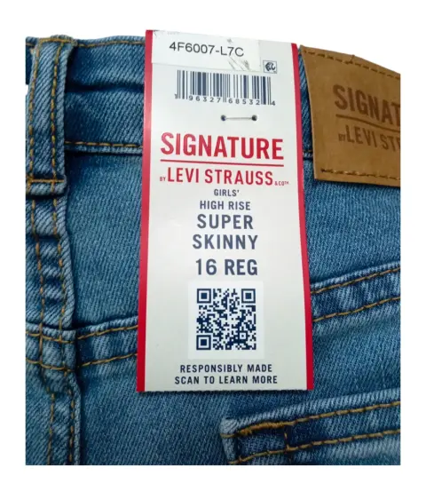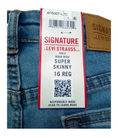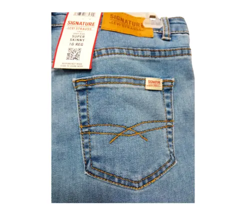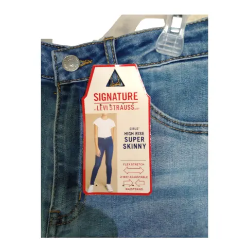 Pantalón para niña marca Signature by Levis Strauss super skinny, tiro alto con estiramiento flexible (strech) y botones de ajuste en la cintura talla 16 regular.Materiales:70% algodón, 29% poliéster, 1% elastano.Medidas 83.5 cm de largo, 68 cm de cintura y 84cm de cadera.