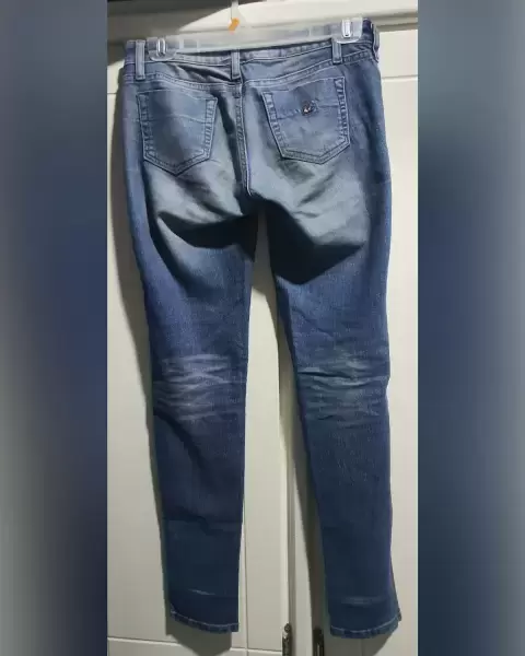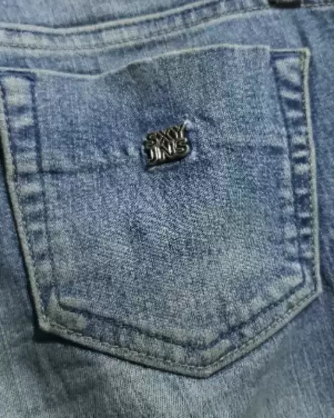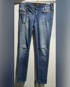 Pantalon de mezclilla, deslavado., tiene cadena en el bolso derecho . Es una edición especial de sexy jeans Solo le falta en boton de enfrente.