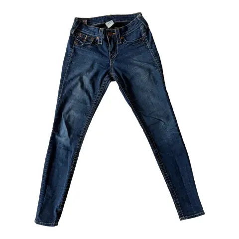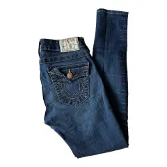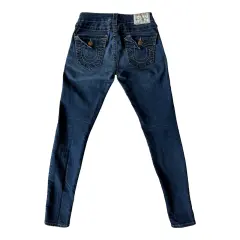 True religion jeans Serena. Jeans a la cadera, tiro medio, dos bolsillos únicamente traseros, stretch, skinny, el modelo es Serena.Talla: 25 Medidas: 32 cm cintura, 34 cm de cadera de costura a costura, 20 cm tiro y 73 cm entrepierna.