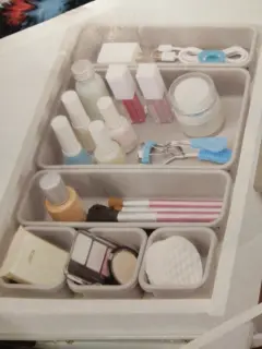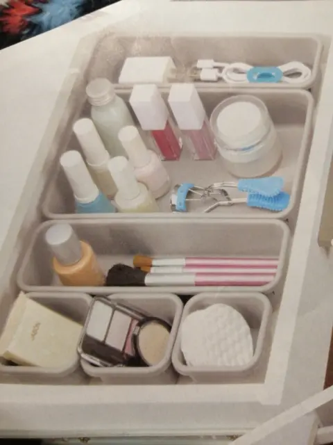 Accesorio organizador y optimizador de espacio para tus cosméticos o collares, anillos, aretes marca Betterware polipropileno son 6 piezas, medidas 8x7x5cm (3 piezas) 24x8x5 CM (2 piezas) 24x16x5cm (1 pieza) color entre beige y gris está nuevo listo para enviarlo