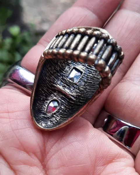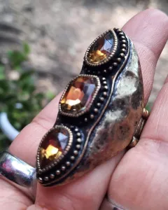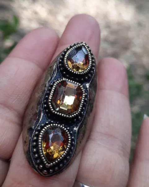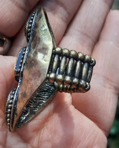 Precioso anillo árabe, de resorte, ajustable desde talla 8 en adelante, precioso de metal latón quemado, con cristales color café, muy hermoso, oro viejo.