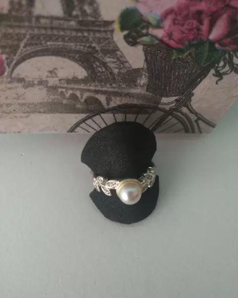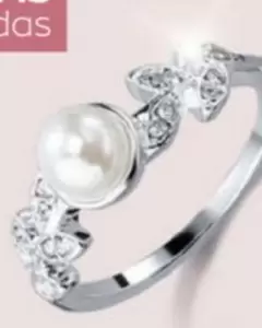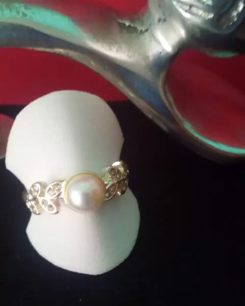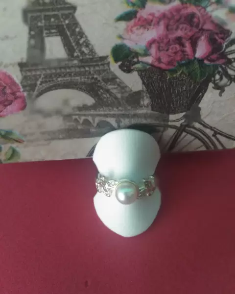 V. Hermoso anillo con baño plateado, 16 piedras de vidrio y una perla acrílica. Medida: 17mm (no. 7). Muy elegante y clásico.💝 Si te gusta algo más de mi Clóset, podemos armar un paquete a un excelente precio 😄☺️