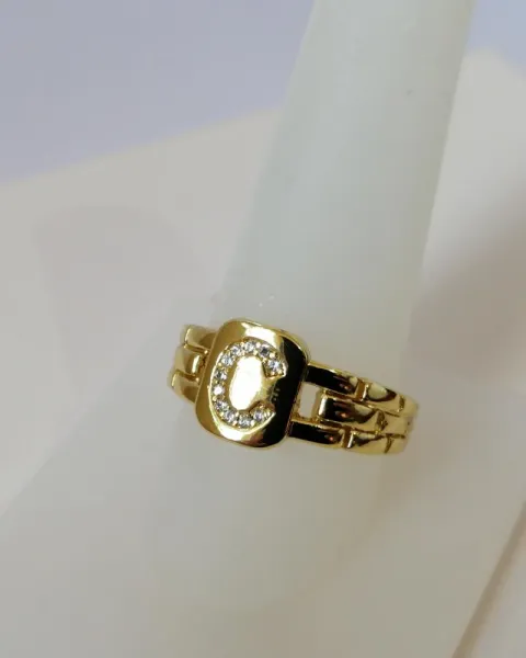 Anillo Cadena Inicial. Anillo ajustable de oro laminado con pedrería. Queda de talla 6 a talla 9. Pregunta por disponibilidad de letras.