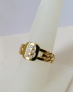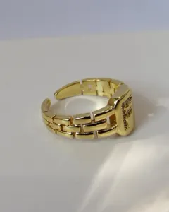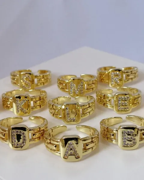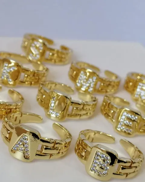 Anillo ajustable de oro laminado con pedrería. Queda de talla 6 a talla 9. Pregunta por disponibilidad de letras.