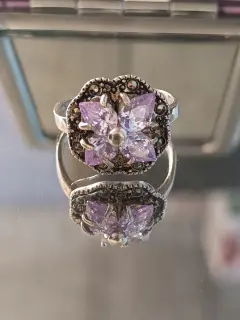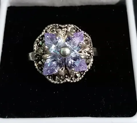 Anillo de plata.925. Hermoso anillo de marquesita color lila del #6.5 Para saber qué número eres puedes medir la circunferencia de tu dedo con una cinta mettrica o bien un hilo y después medir el largo del hilo con una regla porque las medidas son en cm.Cualquier duda pregúntame y con gusto te ayudo 🙂