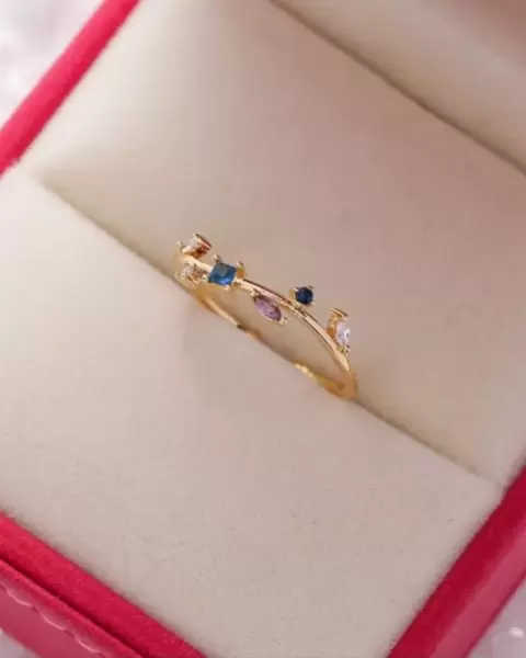 Anillo dorado con brillos. Hermoso anillo ajustable a tu medida color oro con brillos azul, lila y plata