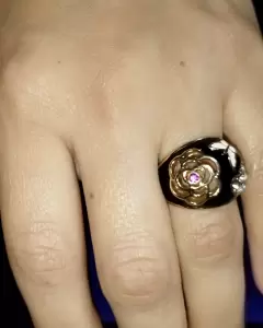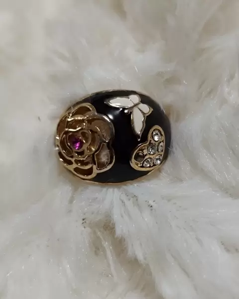 3 lindos anillos de bisutería de gama media, el negro es con baño de chapa de oro y esmaltado (muy parecido a un huevito con flor, corazón y mariposa), el anillo rojo es elástico y de cuentas de metal (diseño muy original); el último de las fotografías es de chapa de oro con cristales zirconia de laboratorio.