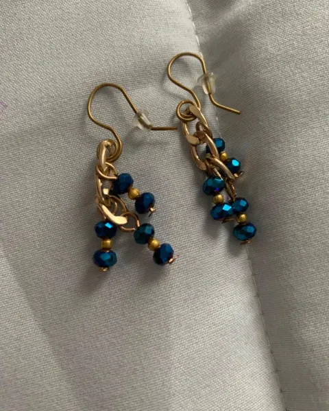 Aretes azules. Aretes colgantes cortos, dorado con azul, muy lindos y elegantes