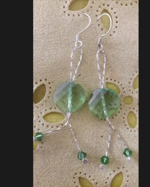 Aretes de cristal corte fino verdes. Cadena y gancho de plata, cristal de corte fino