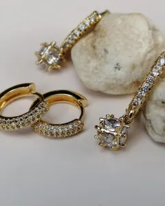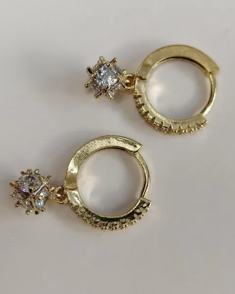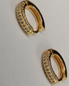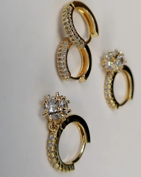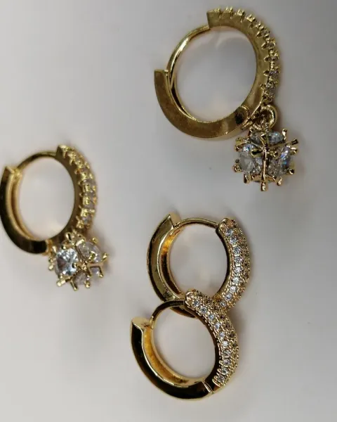 Aretes tipo huggies de y mini hoops de oro laminado con pedrería.