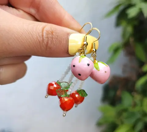 Aretes colgantes con fresas rosas de cerámica y tiras de chaquiras con duraznos. Material del metal: chapado en oroHechos a mano.