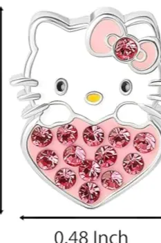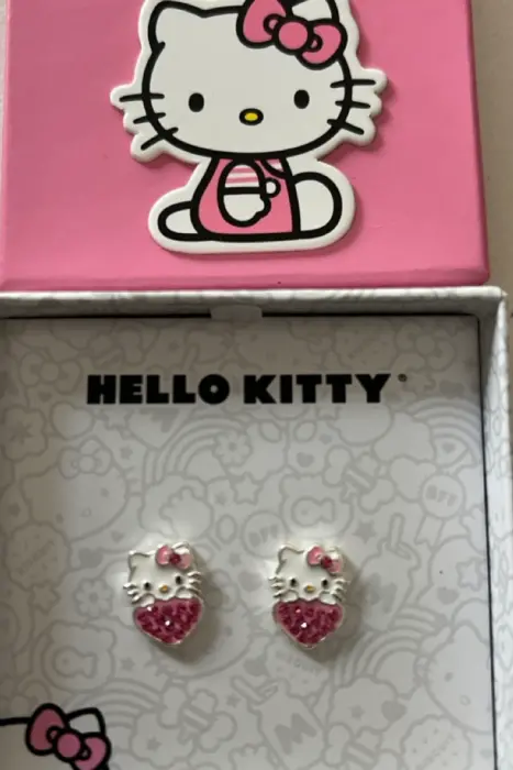 Aretes Hello Kitty en forma de corazón. Arete con licencia oficial de Hello Kitty: vibrantes aretes chapados en esmalte cuentan con Hello Kitty que se asoma sobre un corazón rosa. Los cristales rosa claro embellecen el corazón para un brillo elegante.