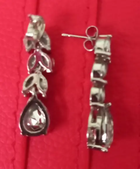 Aretes hechos a mano, largos con pedrería de cristal. Plata sobre aleación de metales. Con broche de mariposa