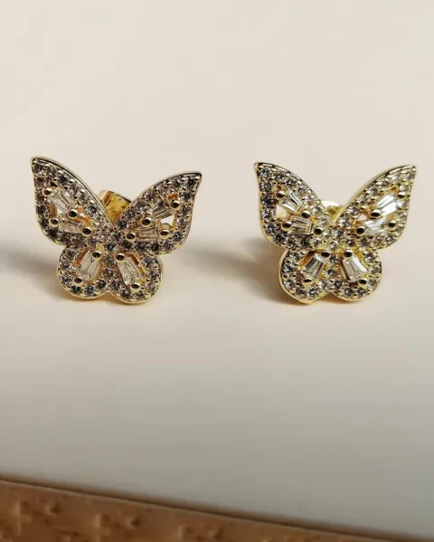 Aretes de oro laminado con pedrería en forma de mariposas.