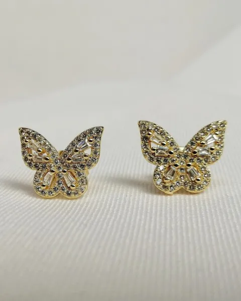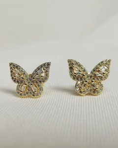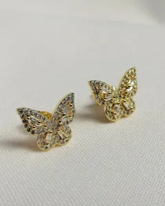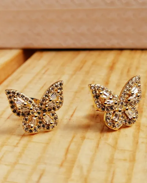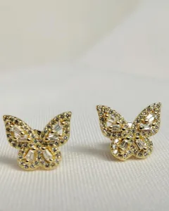Aretes Mini Mariposas. Aretes de oro laminado con pedrería en forma de mariposas.