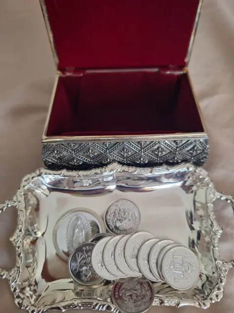 Arras y lazo boda. Arraz (pesatas se plata), cofre y lazo con cristal cortado y baño de plata