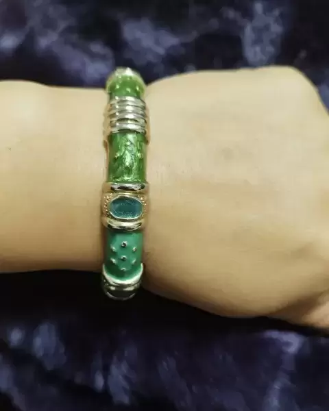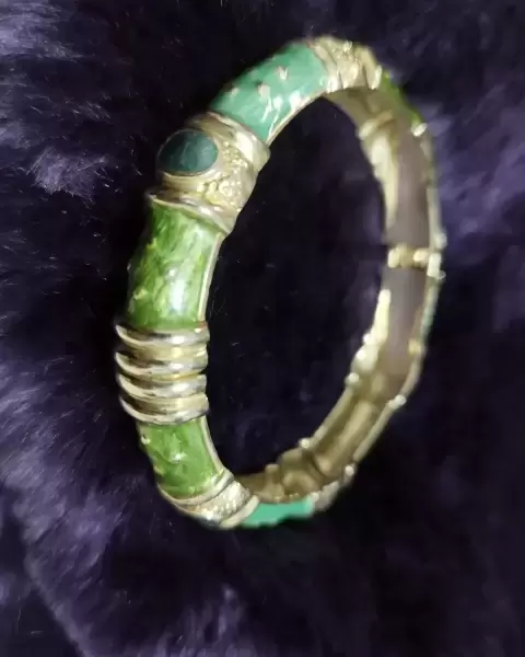 Brazalete verde esmaltado, ha estado guardado bastante tiempo en espera de acompañarte en tu día a día. Se uso un par de ocasiones, estan en excelente estado. El brazalete es de metal esmaltado, no se despinta ni bota el esmalte...esta muy lindo!!