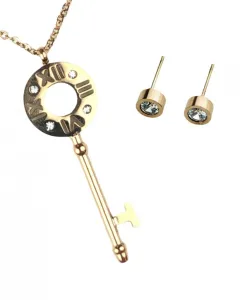 Bonito dije de llave con grabado de números romanos y cristales, incluye aretes todo el juego es de acero inoxidable.