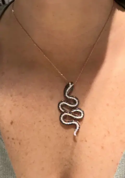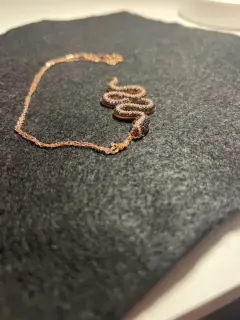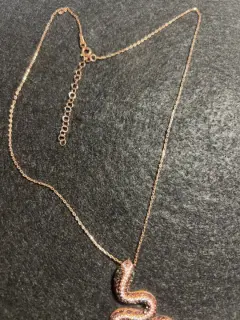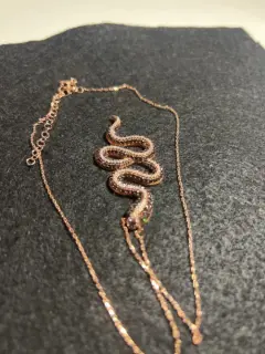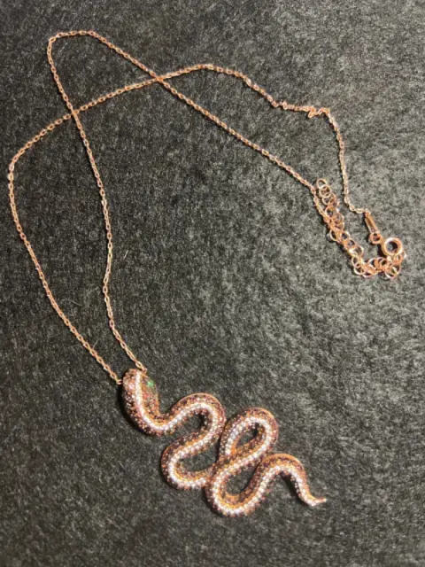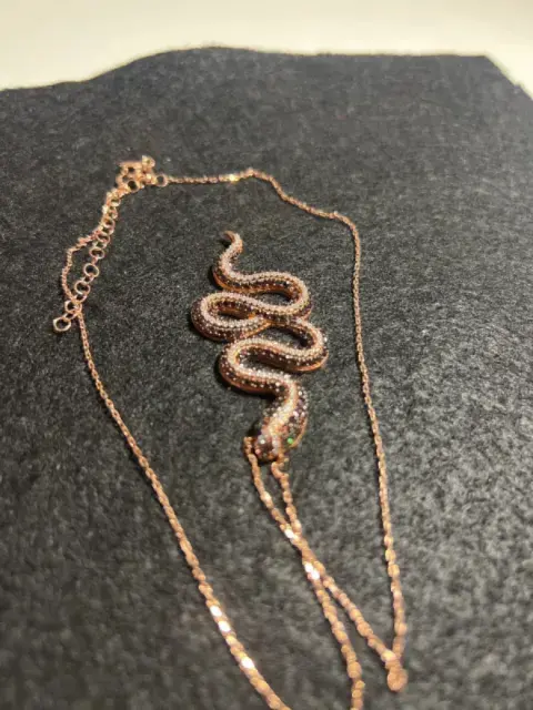 Espectacular, cadena de plata en color oro rosado con dije de serpiente en pedrería blanca y negra, súper brillante, ojos de cuarzo de Esmeralda. Broche con distintos niveles para mejor ajuste…. Todo en plata luce precioso y súper vistoso …!