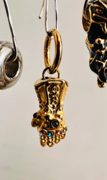 Charm guante gemas del infinito. Charm de acero inoxidable color dorado. Guante de Thanos con las gemas del infinito. Es ideal para dije en una cadena o charm en una pulsera estilo Pandora