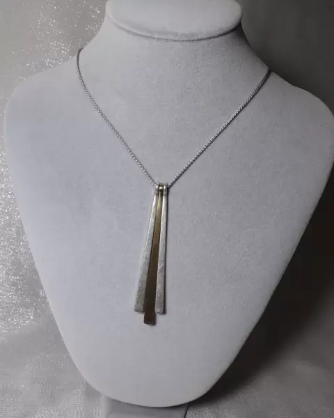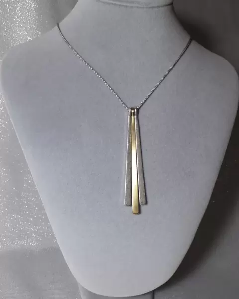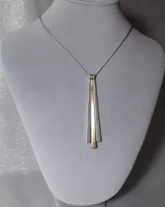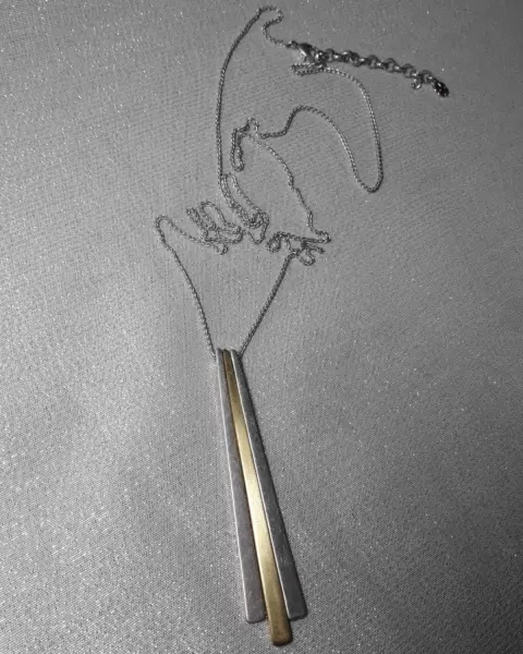 Collar con dije de barras. Hermoso collar largo, con dije de 3 barras en color dorado y plateado, luce súper lindo. Es totalmente nuevo, pero se ha tallado un poco al rosar con otros accesorios, en las fotos se puede apreciar, a simple vista no se nota. Es mercancía de Macy's