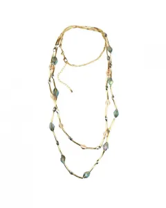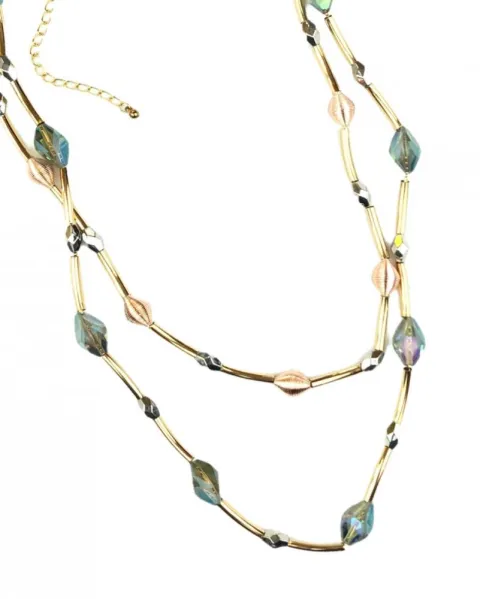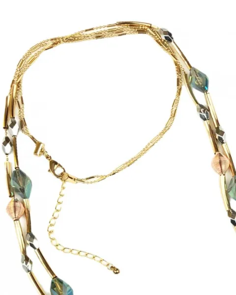 Lindo collar de acero inoxidable, dorado y con cristales en verde tornasol, es un collar largo no te puede faltar en tus accesorios.🤩