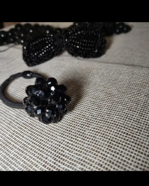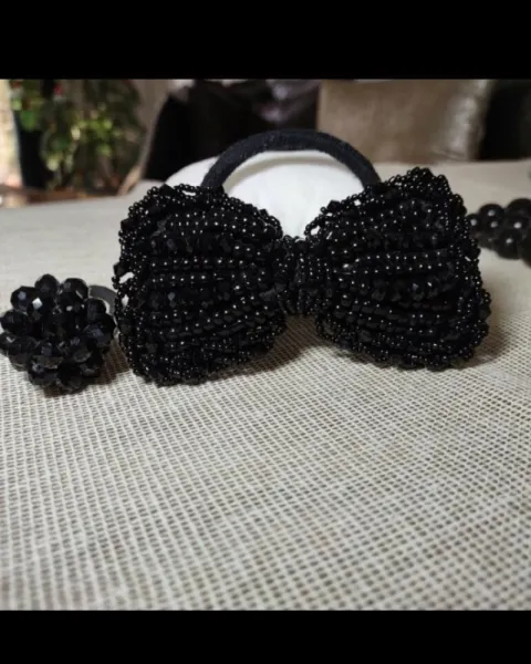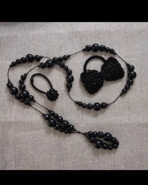 ♠️Black is always right!Collar de madera pintada de negro, va acompañada de accesorios de cabello (un moño de perlas negras con liga) y una esfera de chaquira negra con liga.Medidas:Collar 66cm