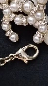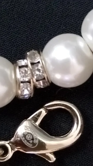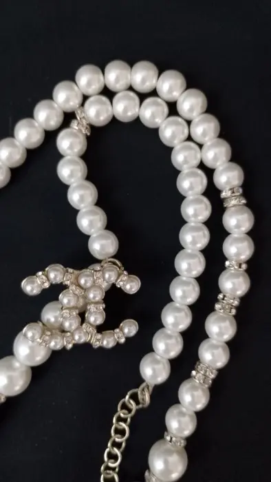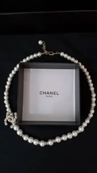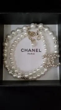 Collar de perlas con dije.. Collar de perlas con anillos brillantes entrelazados, logo CC, broche de ganchito.Medida 44 centímetros. Incluye caja y shopping bag.