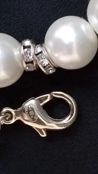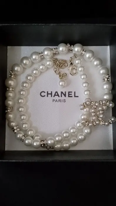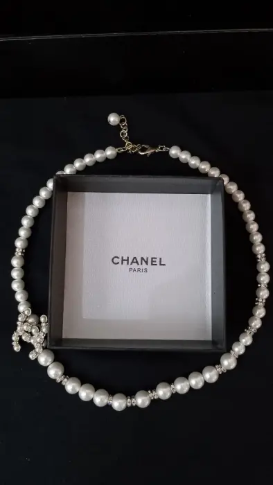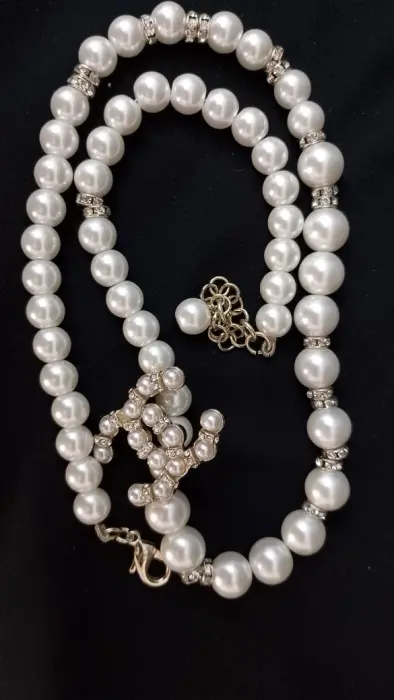 Collar de perlas con anillos brillantes entrelazados, logo CC, broche de ganchito.Medida 44 centímetros. Incluye caja y shopping bag.