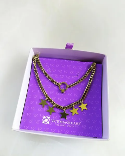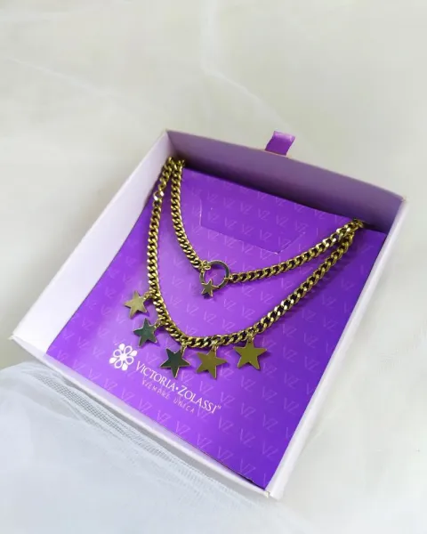 Collar doble con estrellas. Baño de oro de 18K. Tono oro viejo. Marca Victoria Zolassi. Medida: 39 cm.