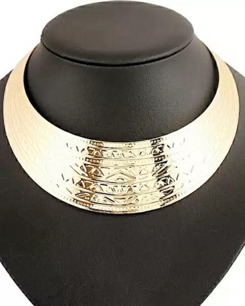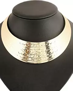 Hermoso collar ancho de metal con detalles de grecas, para lucir como una reina egipcia!