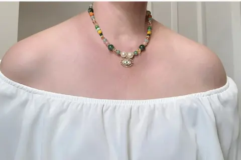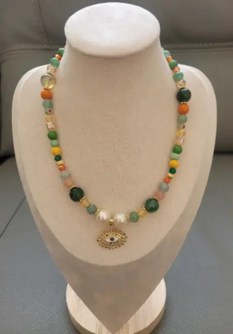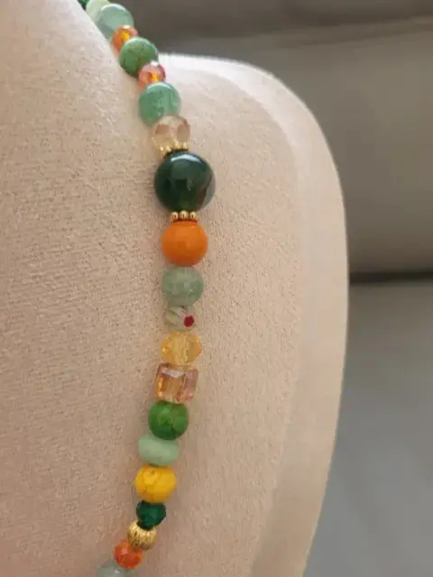 Hermoso collar en cristales multicolor y cuentas y separadores en acero inoxidable color dorado, hermoso dije de acero inoxidable con pequeños cristales multicolor