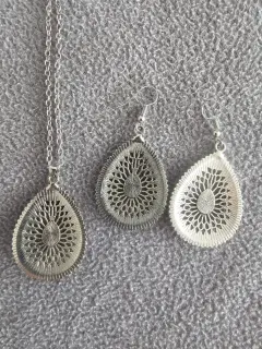 Conjunto de collar y aretes en forma de gota ultra ligeros.Material: MetalTamaño cadena: 40 cm ajustable a 45 cmTamaño de dije: 4.5 cmTamaño de aretes: 4.5 cmSe entrega en bolsa de organza tipo costal.Ideal para regalo 🎁