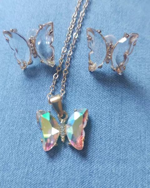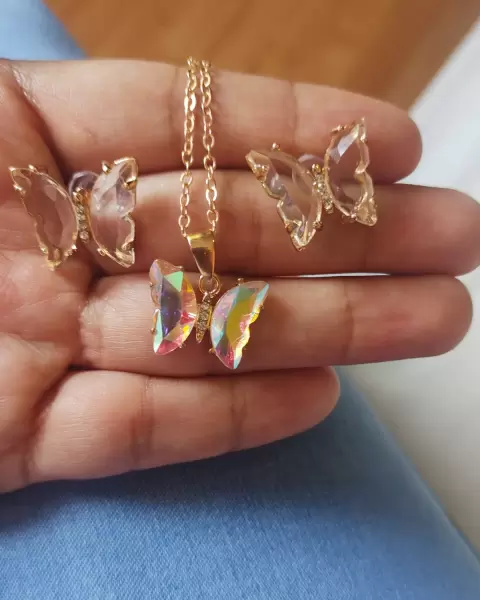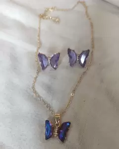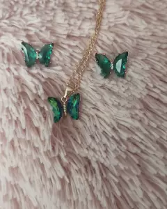 Conjunto de aretes y collar de mariposa cristal. Hermoso, casual y alegante juego de joyería de cristal con dije de mariposa, puedes elegir entre verde esmeralda, blanco o morado, todos son preciosos
