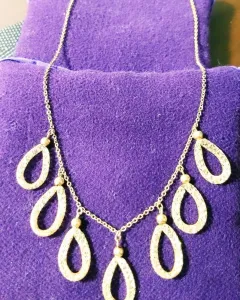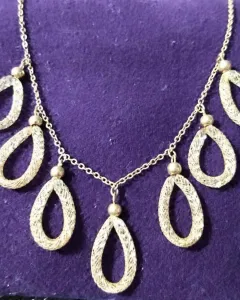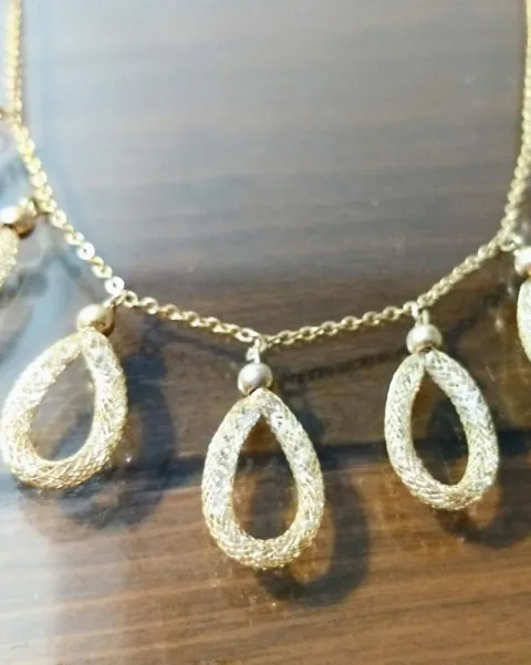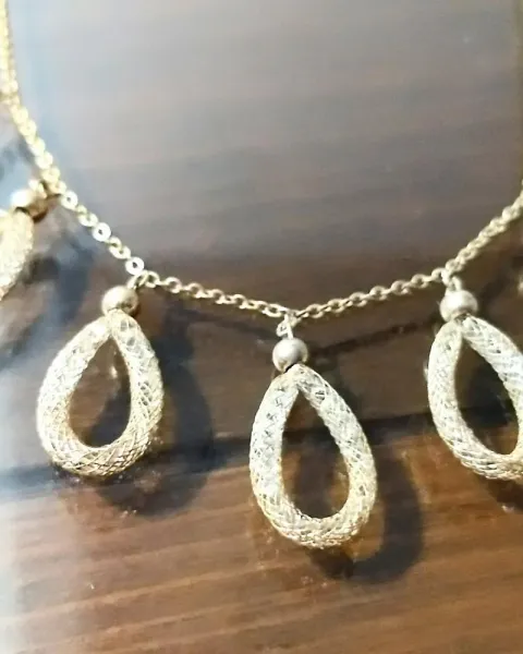 Lindísima y elegante gargantilla de chapa de oro de 14K. Cuenta con 7 anillos en forma de gota hechos en malla con pequeños cristales tipo Swarovsky en su interior. Brilla precioso!Longitud abrochado 25 cm.Envíos los días martes, jueves y sábado.Si te interesa otro producto te hago descuento. 😊