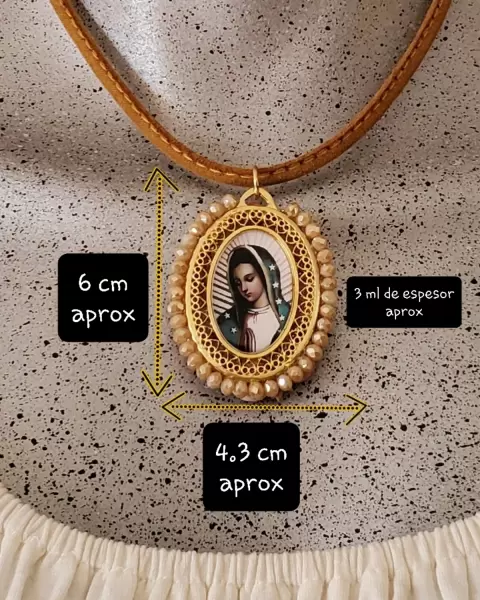 Gargantilla diseño Artesanal con tamaño ajustable, imagen Virgen de Fatima y Virgen de GuadalupeColor de collar cafe claro con detalles doradosMateriales:Medalla con incrustaciones de fantasía, perlitas, diamantes y un toque delicado de flores de pasta francesa.Collar de cuero sinteticoCadena y Gancho en dorado.Empaque: se envia en una bolsita de organza, lista para el empacado personalizado que le gustes dar." TE ENCANTARA "