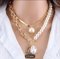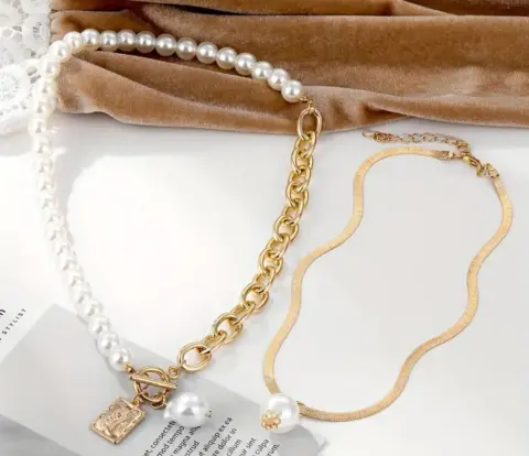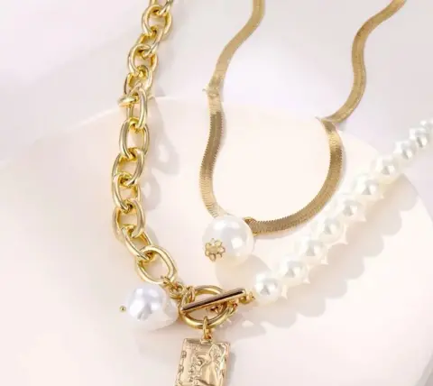 Hermoso juego de collar de perlas, perlas en color blanco y cadena de color dorado, nuevo sin detalles