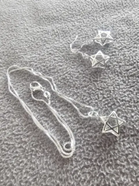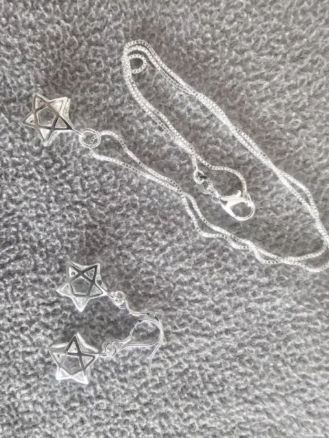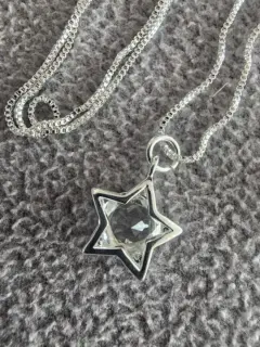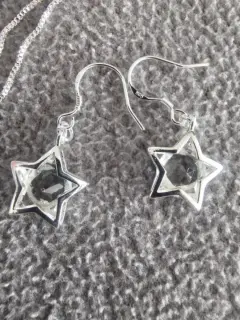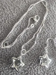 Hermoso juego de collar con dije y aretes de estrella.Material: Plata Esterlina y cristalTamaño cadena: 45 cmTamaño dije: 1.5 cmTamaño aretes: 1.5 cmSe entrega en bolsa de organza tipo costal.Ideal para regalo 🎁Si te gusta cualquier otro artículo de mi colección te hago paquete 😉