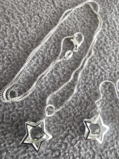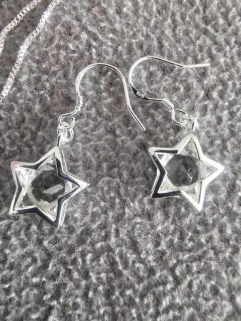 JUEGO ARETES Y COLLAR ESTRELLAS. Hermoso juego de collar con dije y aretes de estrella.Material: Plata Esterlina y cristalTamaño cadena: 45 cmTamaño dije: 1.5 cmTamaño aretes: 1.5 cmSe entrega en bolsa de organza tipo costal.Ideal para regalo 🎁Si te gusta cualquier otro artículo de mi colección te hago paquete 😉