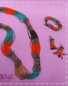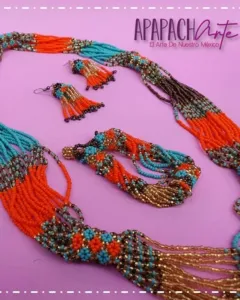 Juego de accesorios artesanales. Juego Artesanal hecho por manos Oaxaqueñas, color azul turquesa, naranja, dorado.