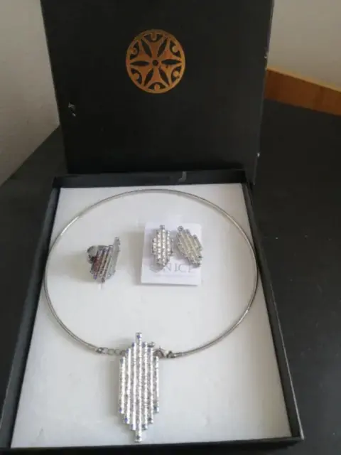 Juego de collar, aretes y anillo. Juego de collar, aretes y anillo, marca nice nuevos, color plata con detalles en azul.