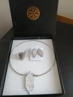 Juego de collar, aretes y anillo, marca nice nuevos, color plata con detalles en azul.
