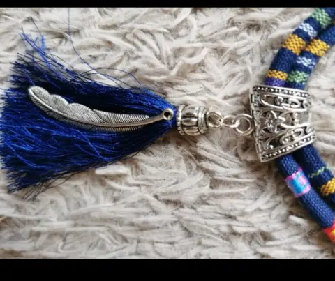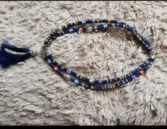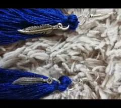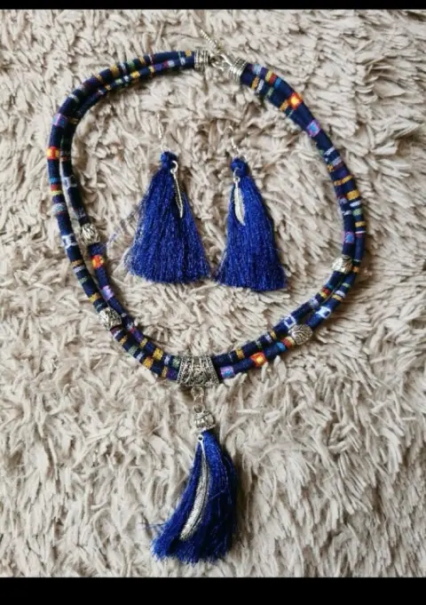 Hermoso juego de collar y aretes, de fantasía, color azul con detalles en pewter tipo plata antigua.