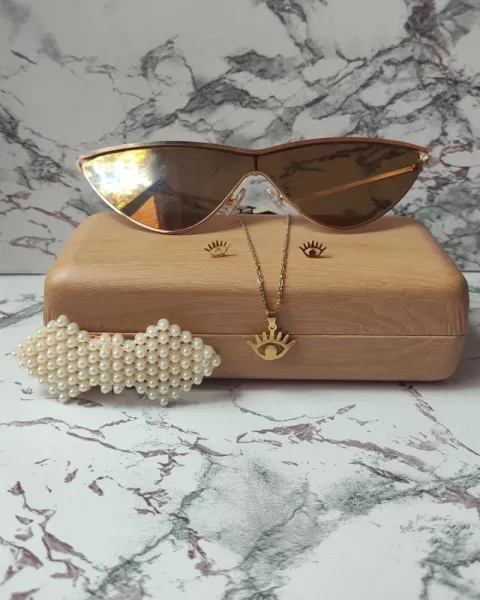 Paquete collar aretes y lentes. Paquete que incluye:Collar y aretes de ojo (acero inoxidable)LentesPinza de perla