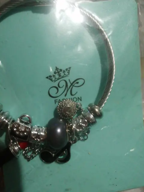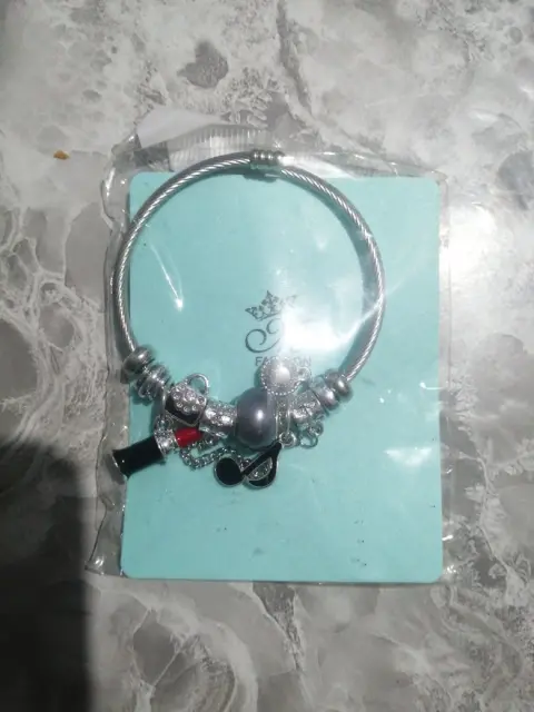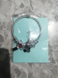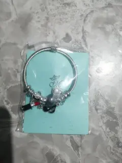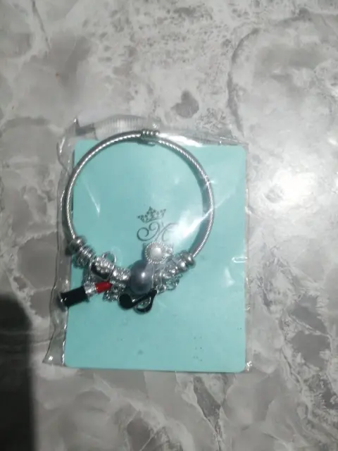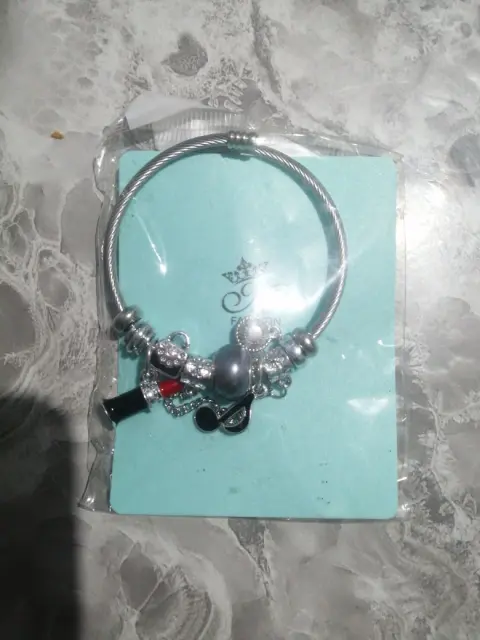 Hermosa púlcera Pandora con 3 dijes y brillantes plateada los dijes uno es de labial el otro de nota musical y el otro es de una piedrita brillosa