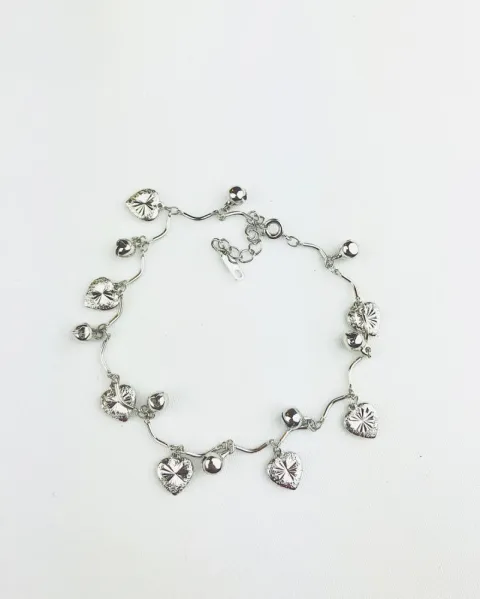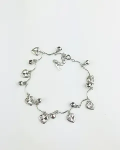 Pulserita de acero inoxidable con corazones y herrajes cascabel en una fina unión color cromo con broche de seguridad.