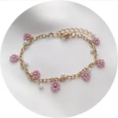 Pulsera chapa de oro flores de chaquira. Dos pulseras de flores de chaquira con elementos de chapa de oro, ajustables. Color blanco y malva claro.