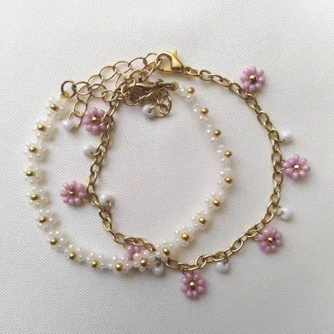 Dos pulseras de flores de chaquira con elementos de chapa de oro, ajustables. Color blanco y malva claro.